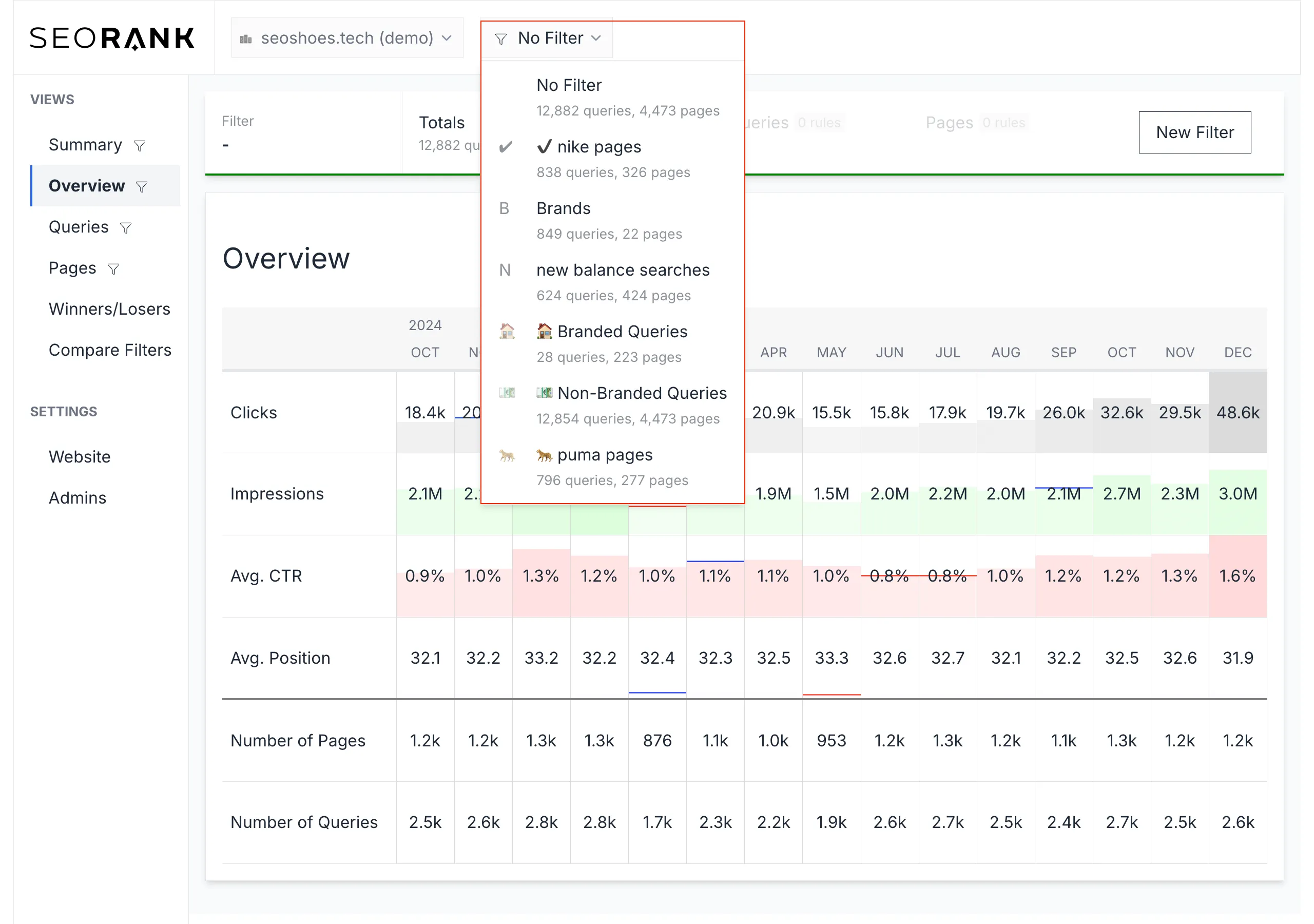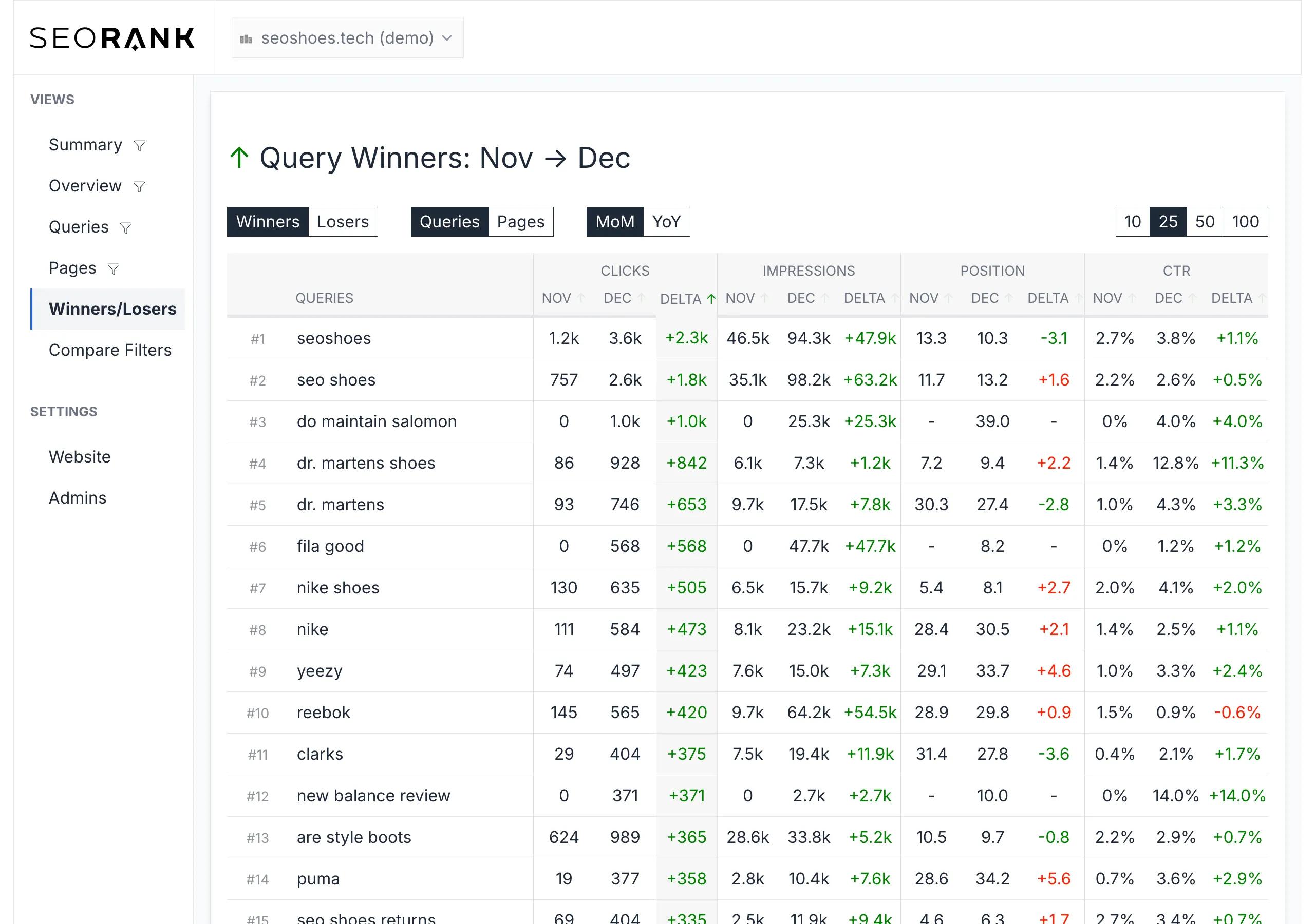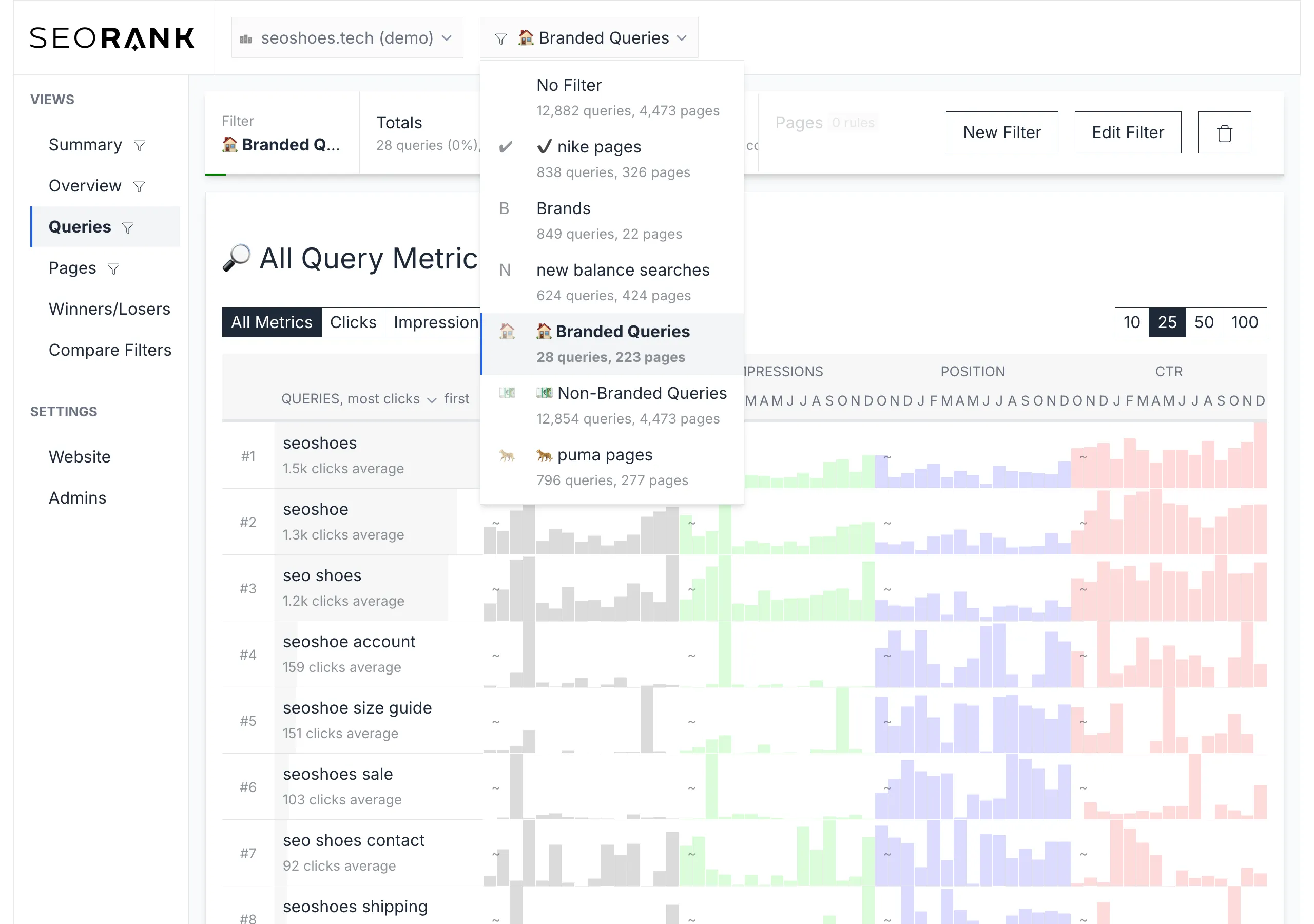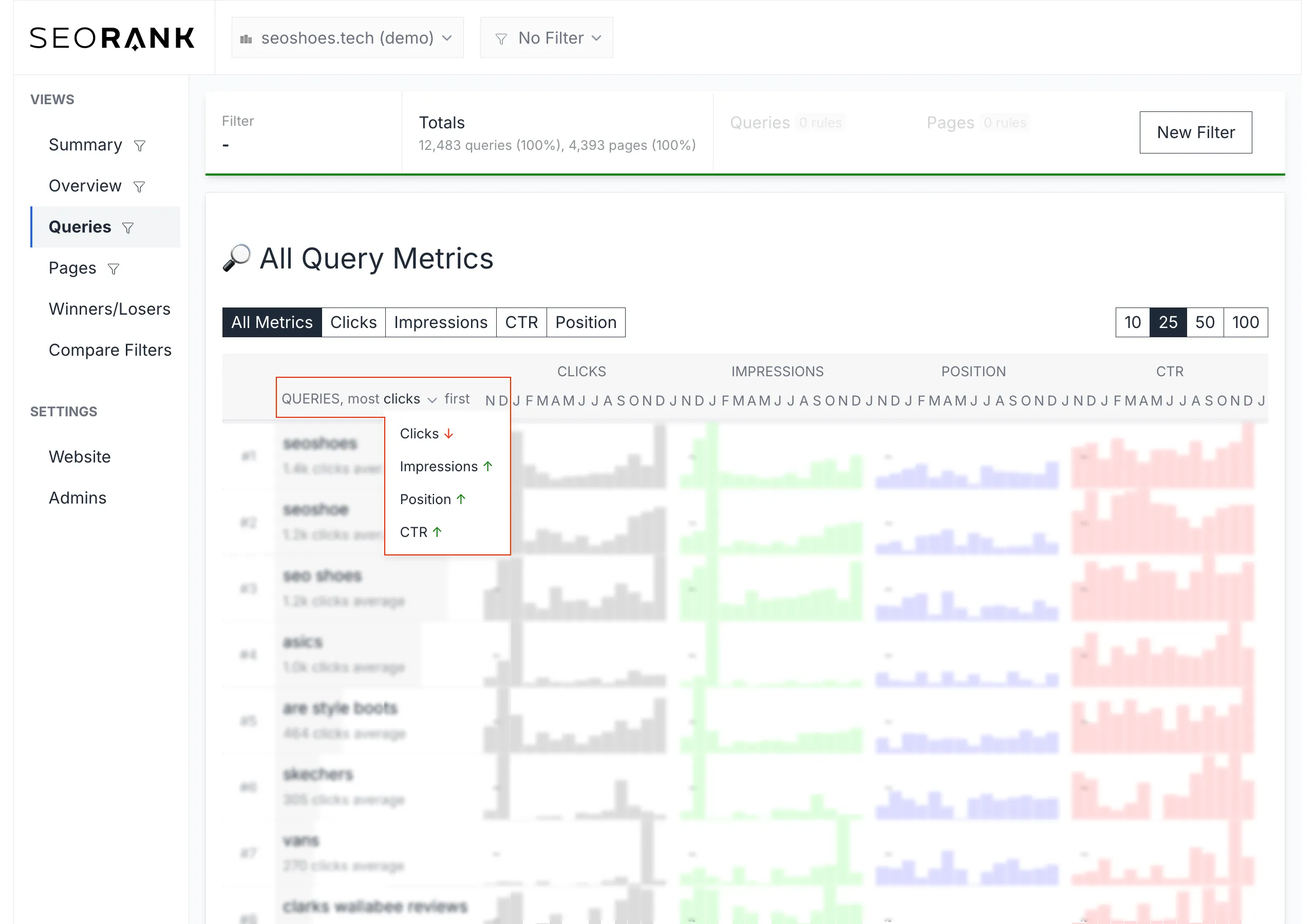 All views can be sorted by clicks, impressions, CTR or average position. This lets you analyze performance from different perspectives.